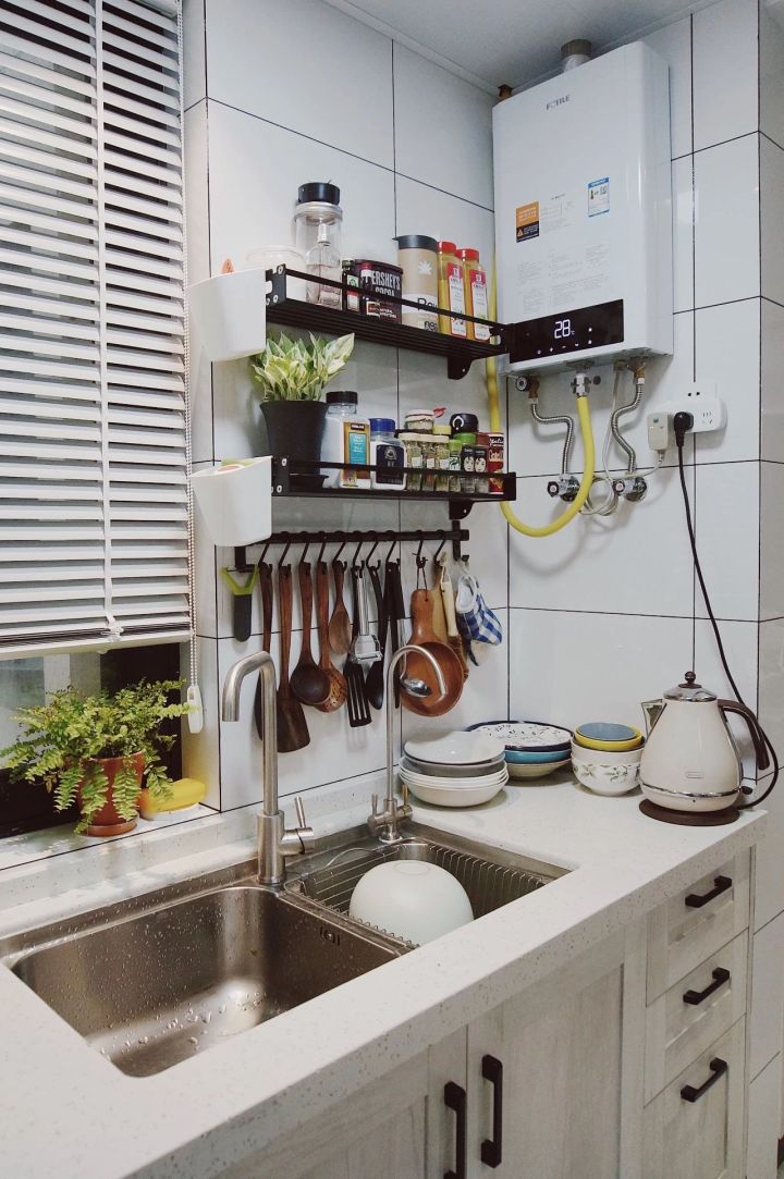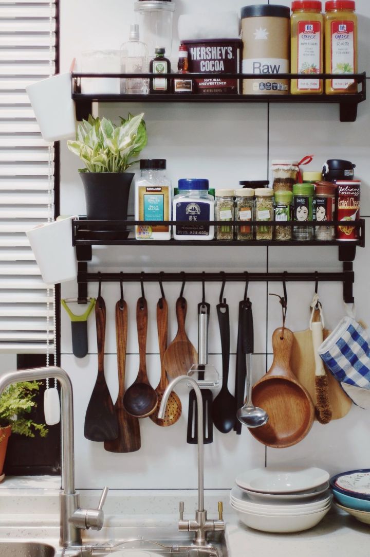 厨房很小,所有能钉架子的墙面都没有空着,搁板放常用的香料(不常用的收在橱柜里),挂杆挂各种勺子铲子。