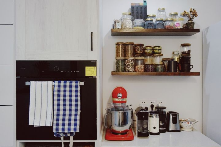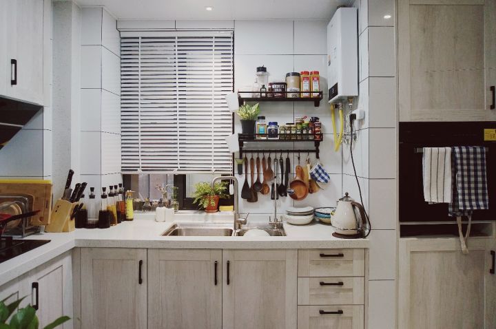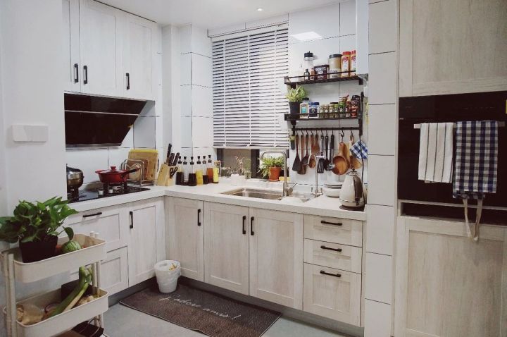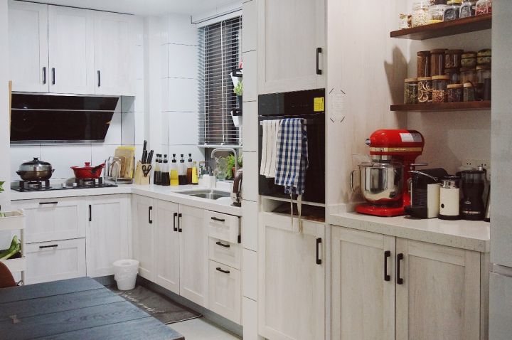 橱柜方面,高柜因某些原因无法移动,在右侧加了一段地柜,自然分离出了小家电区,搁板收纳瓶瓶罐罐,台面摆放电器。