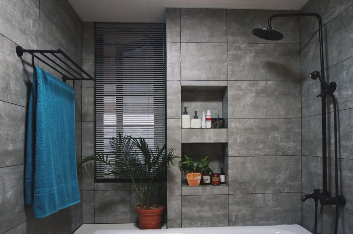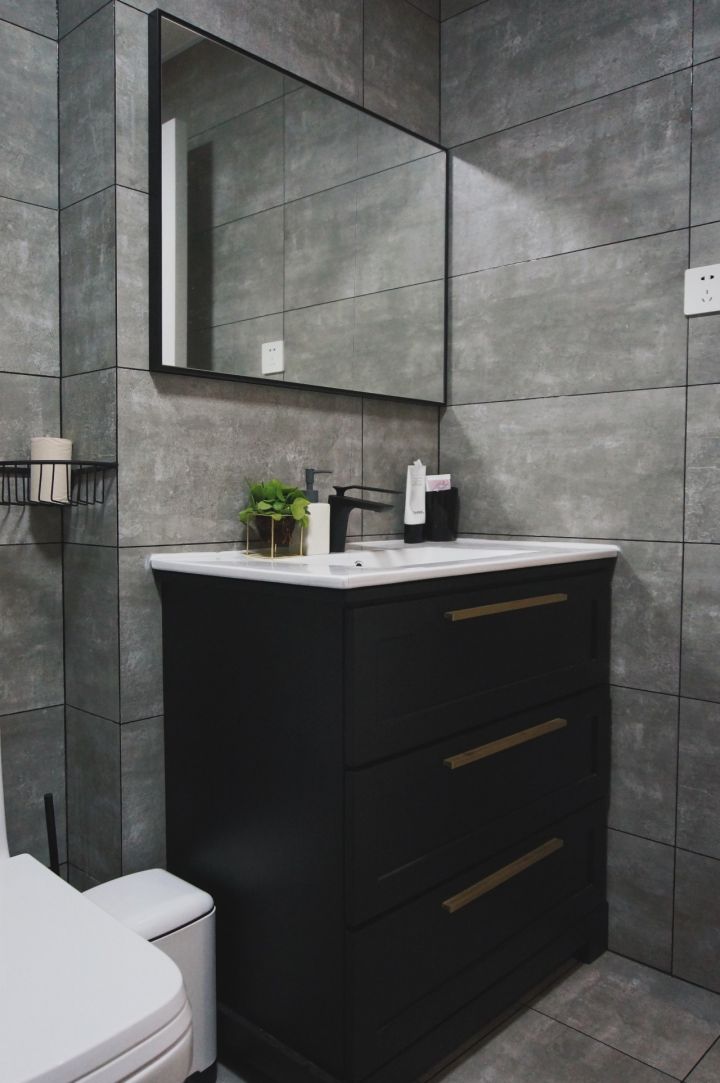 墙面和地面贴了做旧感觉的灰色瓷砖,黑色美缝,黑色浴室柜,黑色五金件,再加上浅灰色百叶帘。