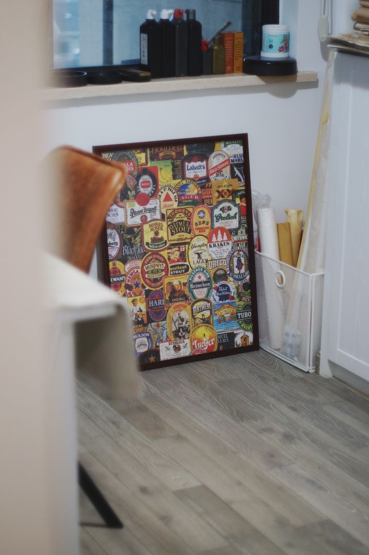 宜家这款收纳篮特别合心意,尺寸刚好卡在书柜的缝里。旁边的画是和妈妈一起拼成的。