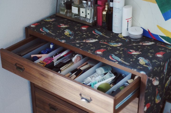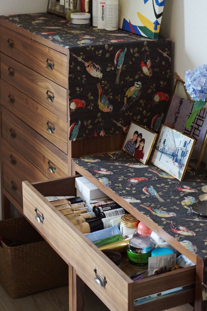 MUJI的收纳盘组合,把不想陈列的化妆品和药膏直接按功能分开,真的省事,盘子尺寸也能适应抽屉。