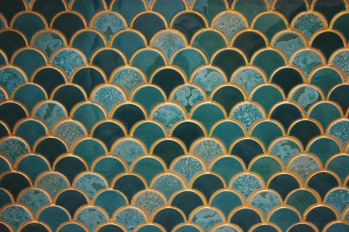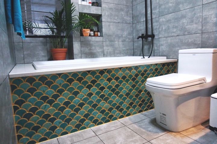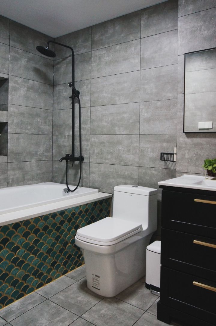 于是整个卫生间的配色偏灰偏黑暗,在浴缸部分用鱼鳞马赛克活跃一下气氛,绿色马赛克,金色美缝。