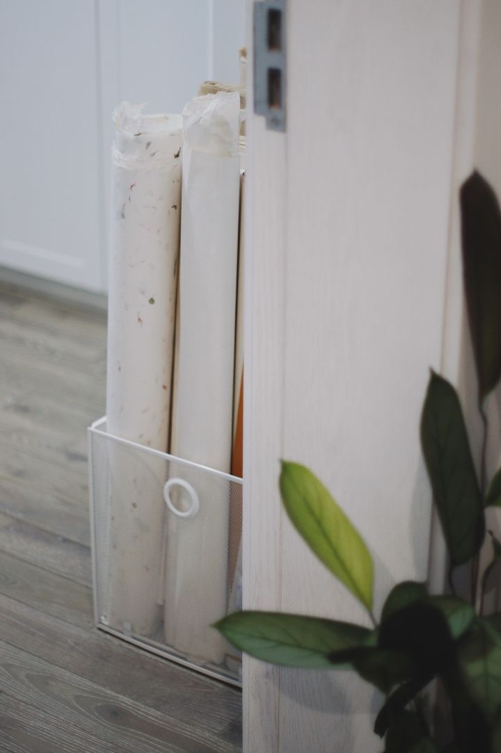 因为异形墙,门口也有一小块转角空间,放另一只收纳筐利用起来。