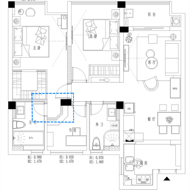 不想让卫生间的门直接面对床,堵上了有门洞的墙,在侧面开了新门,为此还把书房缩进去了一些。