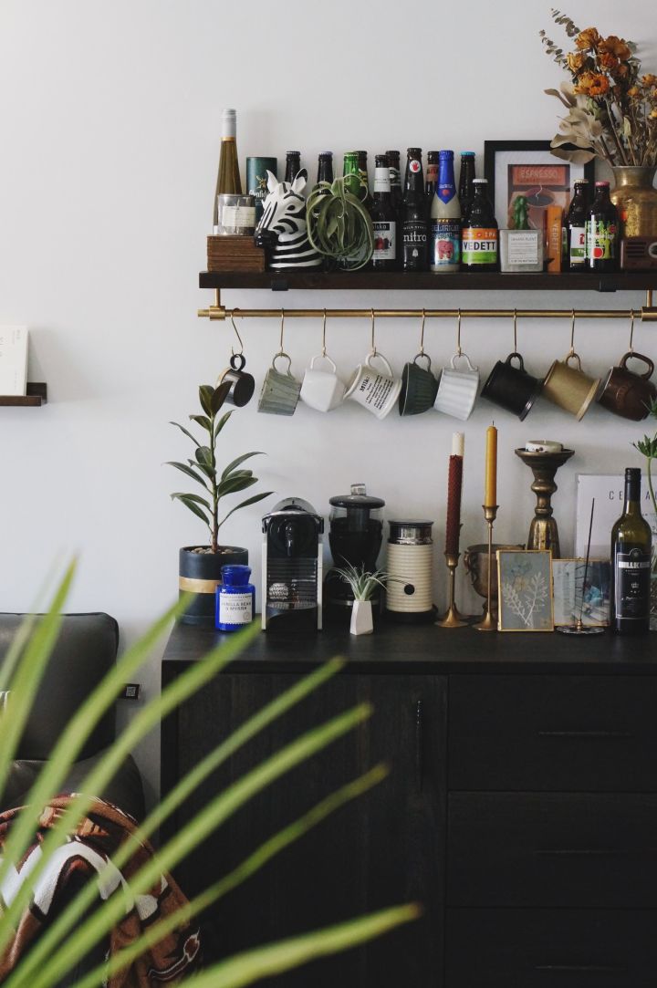 后来深深觉得“能上墙绝不上桌”太正确,再次用搁板+挂杆把瓶瓶罐罐铺满了一面墙。整齐悬挂的杯子本身就带有强烈的装饰性,黄铜挂杆也很美貌。
