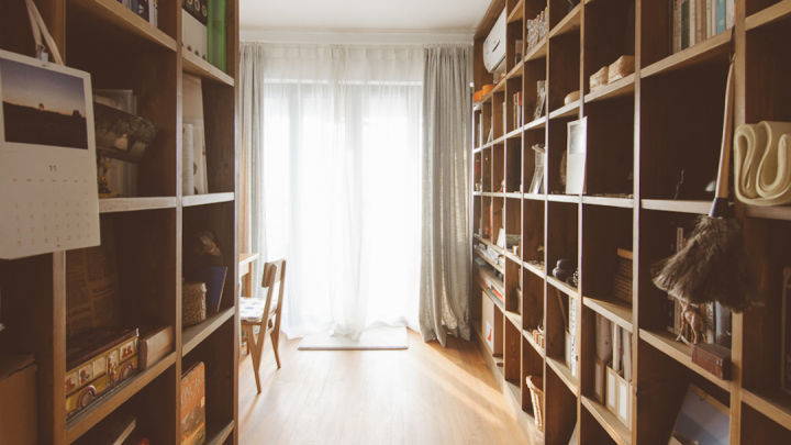 书房里,书架做面对面的两组,深度都是32cm。对于普通的书籍,算是比较深了,但是要放一些大开本的设计书,还要收纳一些小藏品,就做深了一些。