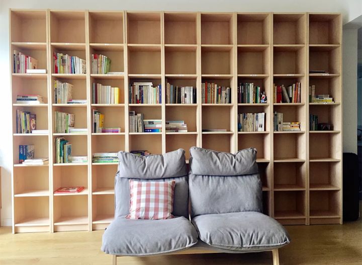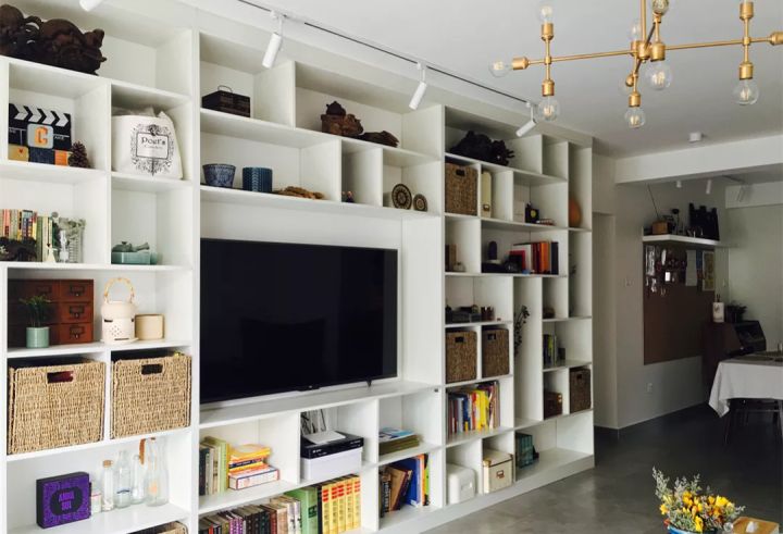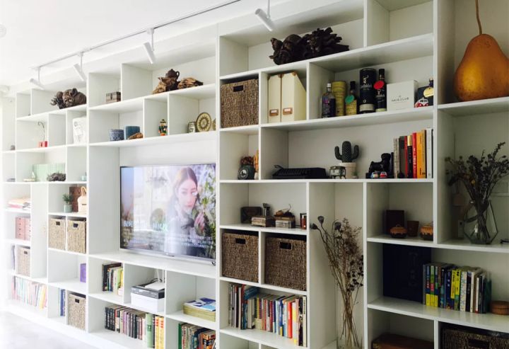还可以电视柜+书架结合设计,格子设计比较跳脱,以宜家收纳筐的尺寸为基础做一个最小的单元格,然后上下左右合并。
