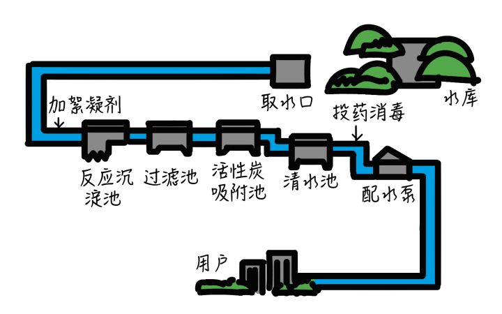 在这套净水系统里,自来水进了家以后,处理过程大概是下面这样: