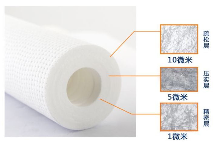 可以理解为,将一大张带有孔隙的“布”绕着有孔水管缠上很多层,越是靠近水管的内层纤维越细越紧密,靠近外层的纤维比较粗比较疏松,每一层“ 布”都能拦截水中的杂质,过滤精度在1-5μm。