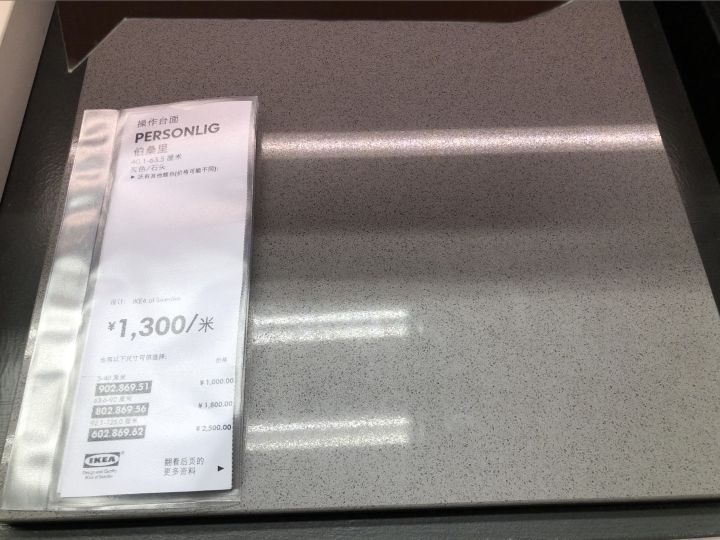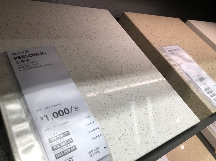 另外两种台面,石英石台面和亚克力台面,在宜家台面中价格颇高,不少人选好一整套橱柜后价格超支就是因为它们。