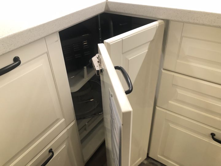 如果你家厨房的墙角有包管,一定要确认包管的尺寸,如果转角柜内的空间太小,是无法安装转角拉篮配件的。