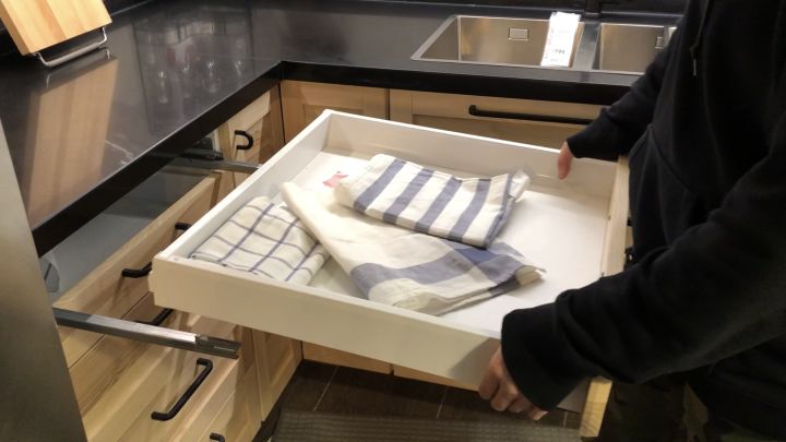 橱柜的抽屉根据柜子的大小设置,其中比较有意思的是,宜家橱柜的抽屉有一种“抽屉包抽屉”的设计,这个设计将地柜的竖向空间充分利用,不浪费分毫。