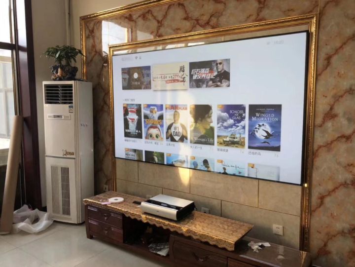 于是,厂家就在激光投影上搭载智能系统、内置音响系统,机身后面加上HDMI、USB接口,能连PS4、Switch还有移动硬盘,最后配上抗光幕,玩游戏、追剧都可以满足,这样下来真的就很有电视的感觉了,所以“激光电视”这个概念开始风行起来。