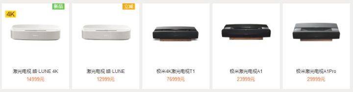 极米是最早提出“无屏电视”、把投影概念往传统电视方向引导的企业,他家的激光电视有五种型号,价格跨度较大,2万元以内的只有LUNE和LUNE 4K两款,最贵的是极米T1,接近8万元。