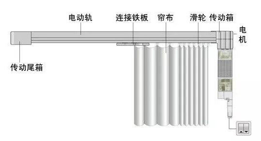 电动窗帘其实很简单,就是加了一个电机,由电机驱动窗帘在轨道上来回移动。