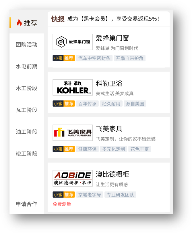 根据会员的需求,严选合作主材品牌,确保品牌提供的价格和服务足够有竞争力,并且严格把关合作品牌的经营资质。
