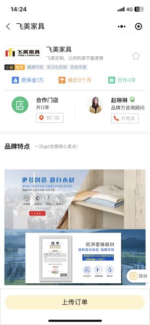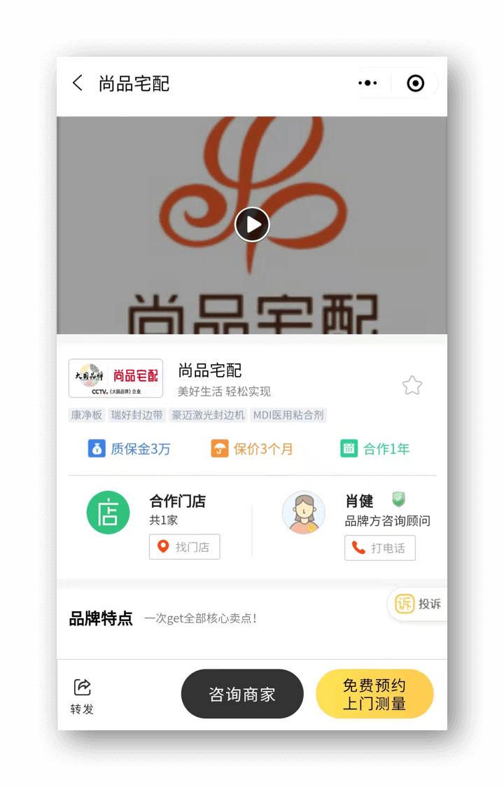 在品牌页面,您可以电话联系商家、查看门店、发起提问、部分商家支持预约上门测量。
